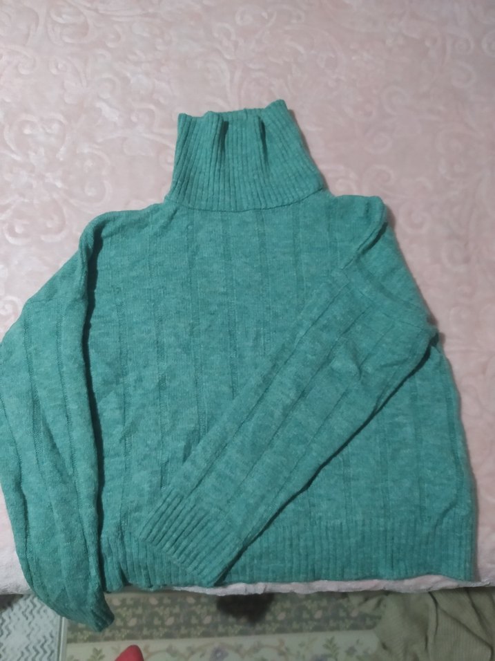 Turkuaz renkte, balıkçı yaka ve uzun kollu, örme dokulu, rahat kesim kadın triko kazak. Günlük sokak stiline uygundur.