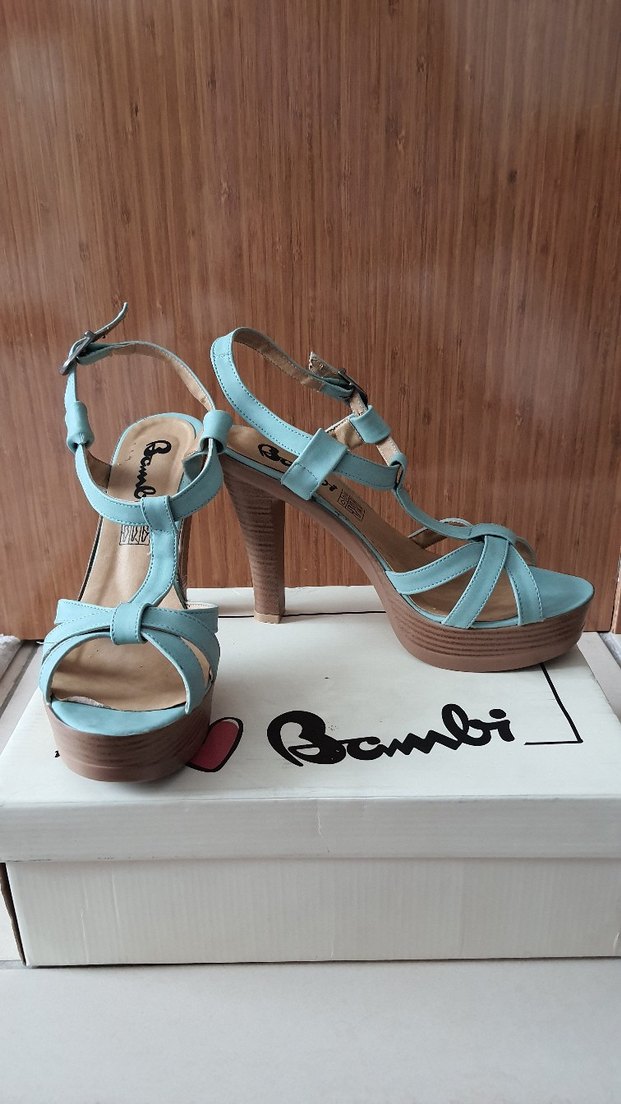 Turkuaz renkli, tokalı bantlara ve ahşap görünümlü tabana sahip platform topuklu kadın ayakkabısı, çağdaş tarzda ve romantik buluşmalar için uygundur. Pazarlık yaparım.