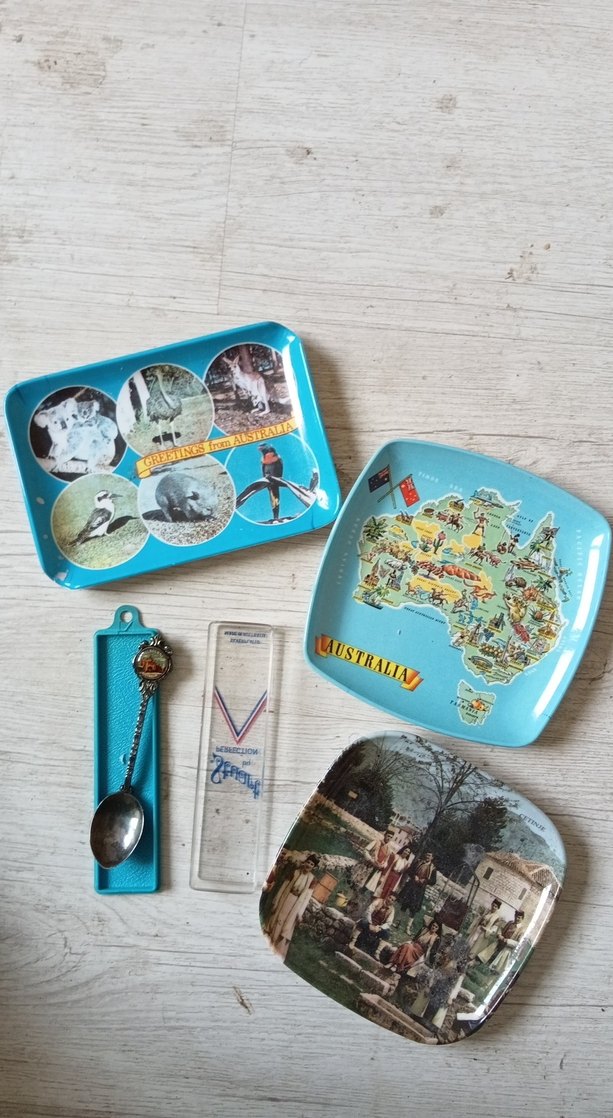 Turkuaz renginde, Avustralya temalı baskılı tabaklar ve dekoratif kaşık ile şeffaf cetvel içeren set. GÜMÜŞ KAŞIK.