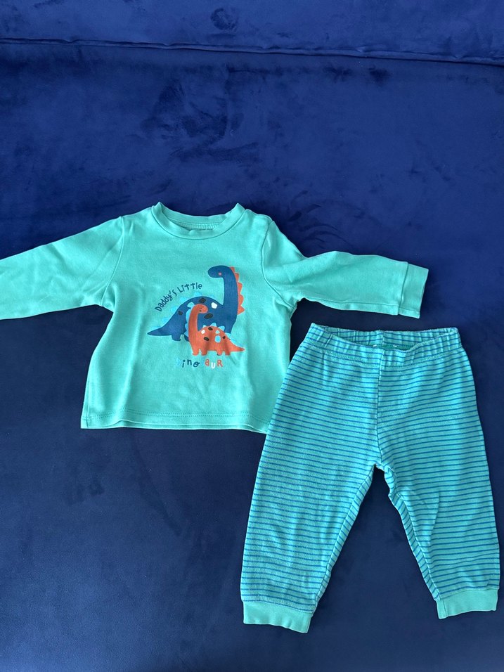 Turkuaz renkte, yumuşak kumaştan, uzun kollu ve bisiklet yaka, dinozor baskılı bebek erkek takımı. Çizgili desenli pantolon ile tamamlanmıştır.