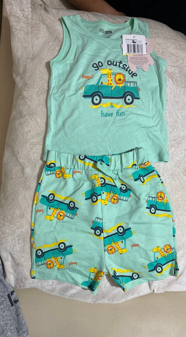 Turkuaz renkli, baskılı kısa kollu üst ve şorttan oluşan bebek erkek takımı. Yumuşak ve sıcak kumaş kullanılmıştır.