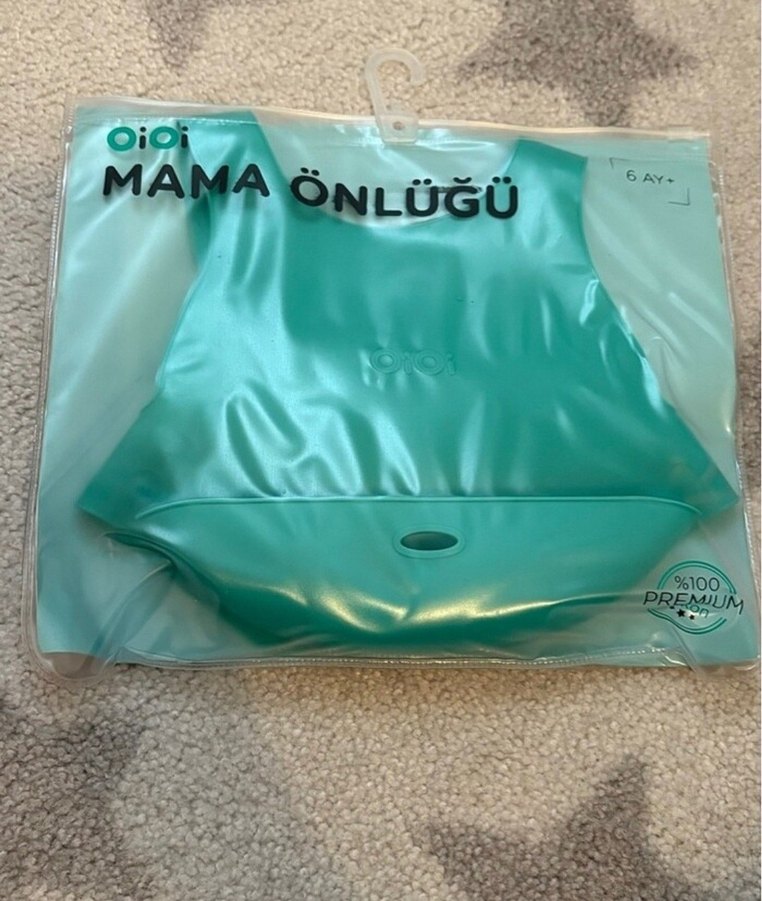Pastel turkuaz renkte, baskılı desenli 6 aylık bebekler için mama önlüğü. Yemek döküntülerini yakalamak için pratik cep bulunur.