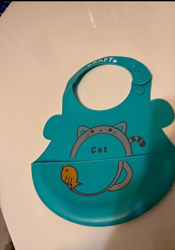 Turkuaz renkte, baskılı kedi desenli, ayarlanabilir çıtçıtlı ve döküntüleri tutan cepli bebek önlüğü.
