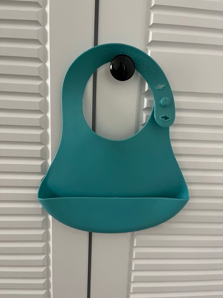 Koyu turkuaz renkli, baskılı bebek önlüğü, kırıntı yakalayan cep ve ayarlanabilir kapanış özelliğine sahiptir.