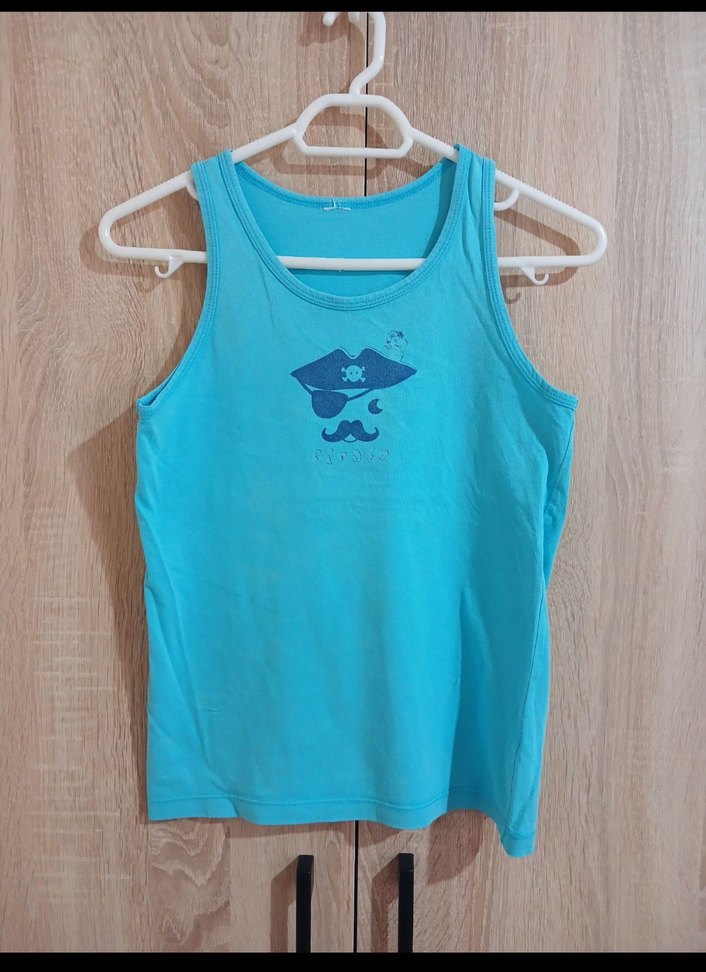 Turkuaz renkli, baskılı korsan figürlü çocuk atlet. Yumuşak ve rahat kumaş, sıcak hava için uygun. ☠️