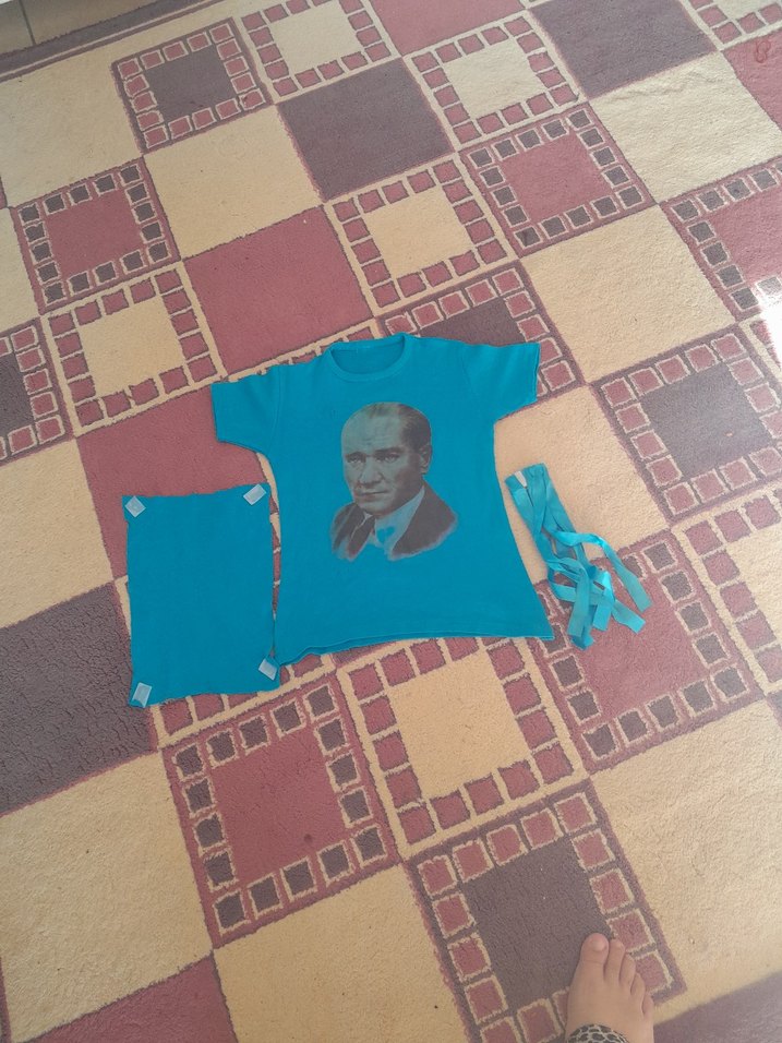 Turkuaz renkte, baskılı portre deseni olan çocuk atleti ve yanında uyumlu kumaş şeritleri bulunur. Yumuşak dokuludur.