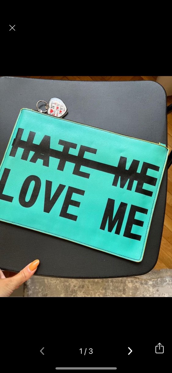 Turkuaz deri clutch çanta, baskılı yazı ve cesur counterculture tasarıma sahip. Rock punk ve grunge punk tarzıyla romantik akşamlar için uygun.