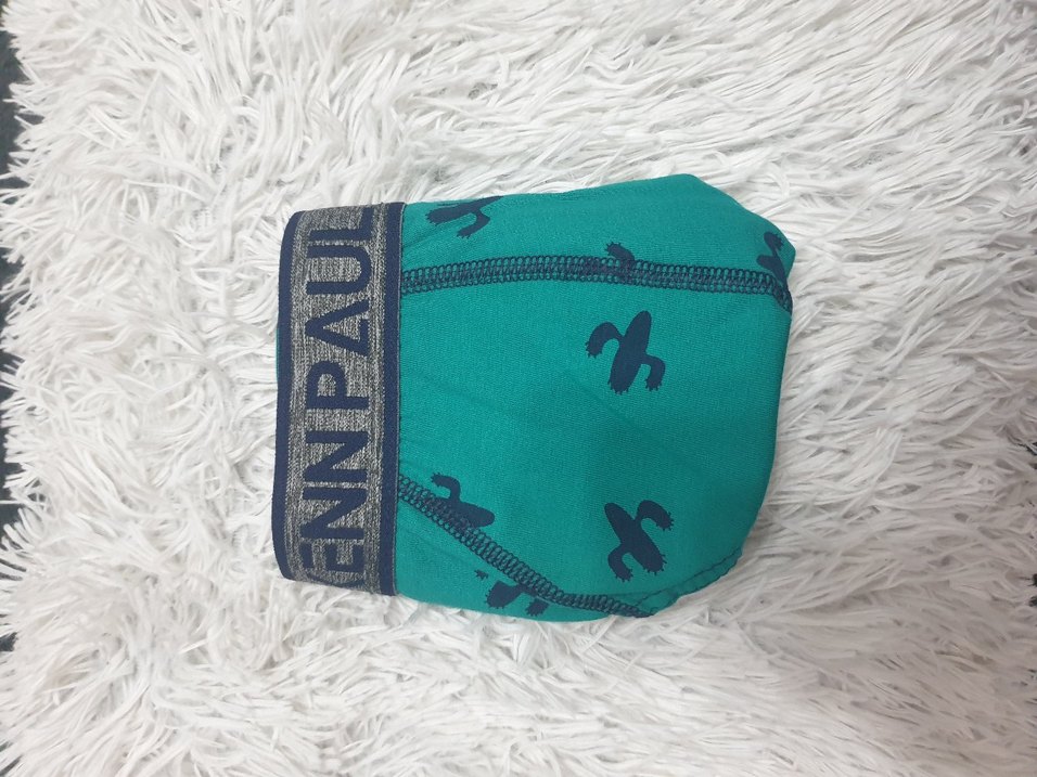 Koyu turkuaz renkte, baskılı desenli, markalı lastikli ve normal boyda fit kesim erkek boxer.