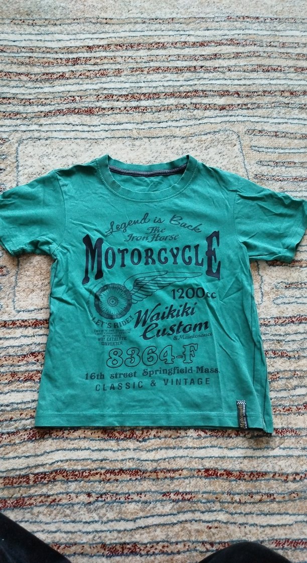 Turkuaz renkli, pamuklu, bol kesim erkek çocuk tişörtü. Kısa kollu ve bisiklet yaka, renkli baskılı motosiklet temalı retro tasarım içerir. ️