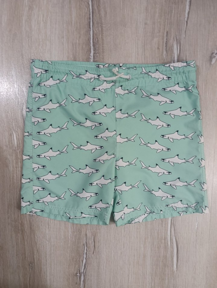 Turkuaz renkli, köpekbalığı baskılı erkek çocuk mayo şortu, lastikli bel ve bağcıklı detaylıdır.