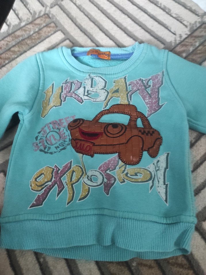 Turkuaz renkli, uzun kollu, bisiklet yaka erkek çocuk sweatshirtü. Renkli baskılı araba motifi ve örgü dokusuyla rahat, bol kesim tarzda tasarlanmıştır.