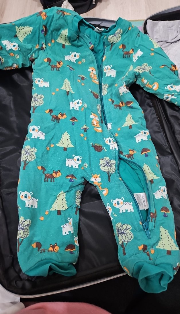 Turkuaz renkli, rengarenk hayvan ve ağaç desenlerine sahip, ön fermuarlı yumuşak ve sıcak kumaştan yapılmış bebek tulumu. Sokak stili için uygundur. hafif tuylenme var