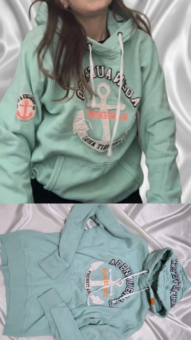Turkuaz renkli, baskılı ve uzun kollu, kapüşonlu sweatshirt. Oversize kesimi ve fermuarlı detaylarıyla rahat ve sıcak tutar.