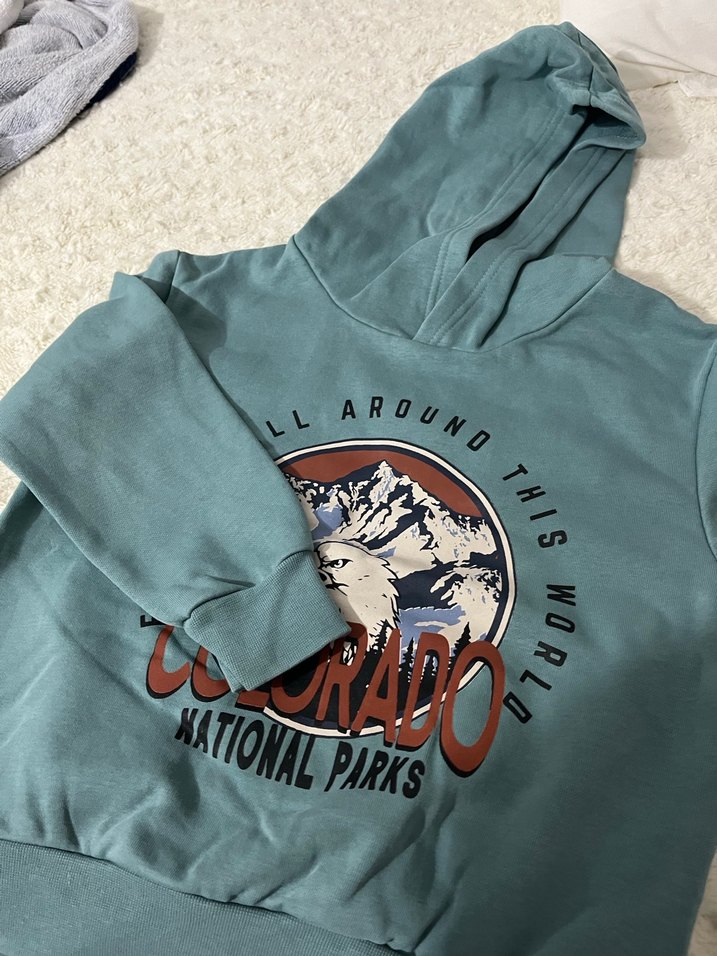 Turkuaz renkli, uzun kollu ve fermuarlı kapüşonlu sweatshirt. Colorado Ulusal Parkları baskılı, rahat kesim ve sıcak tutan kumaştan yapılmıştır. ️
