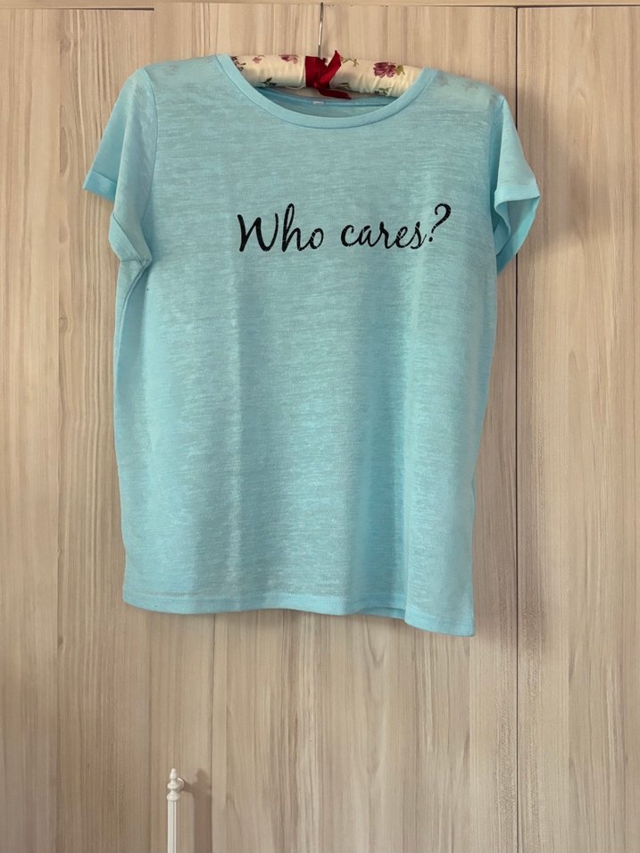 Turkuaz renkli, ince kumaştan, kısa kollu, yuvarlak yakalı bol kesim tişört. "Who cares?" baskılı, günlük kullanıma uygun rahat bir model.