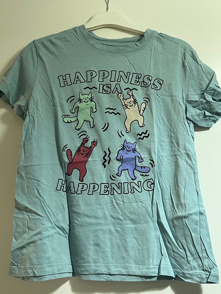 Turkuaz renkli pamuk kız tişörtü, kısa kollu ve bol kesimdir. Üzerinde 'HAPPINESS ISA HAPPENING' yazılı renkli dans eden kediler baskısı vardır.