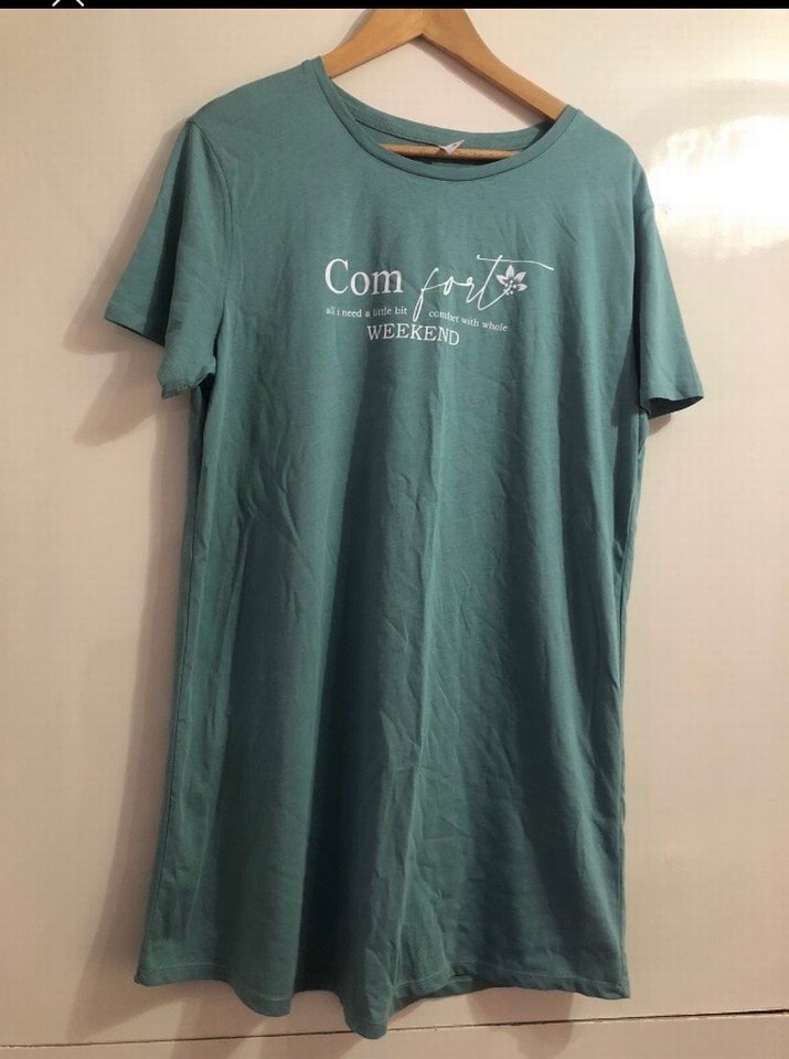 Turkuaz pamuk tişört, kısa kollu ve yuvarlak yaka, bol kesim ve midi boyda. 'WEEKEND' baskılı, günlük rahat ve şık stil sunar. Çok rahat spor şıklığın da bir penye elbise. M bedendir. Yenidir , hiç kullanılmadı. Kızıma aldım ama olmadı maalesef, iadede edemedim.