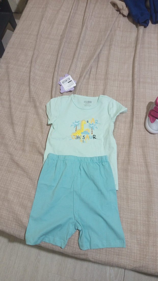 Turkuaz kısa kollu pamuklu üst, baskılı dinozor deseni ve uyumlu şorttan oluşan rahat ve şık bebek erkek takımı.