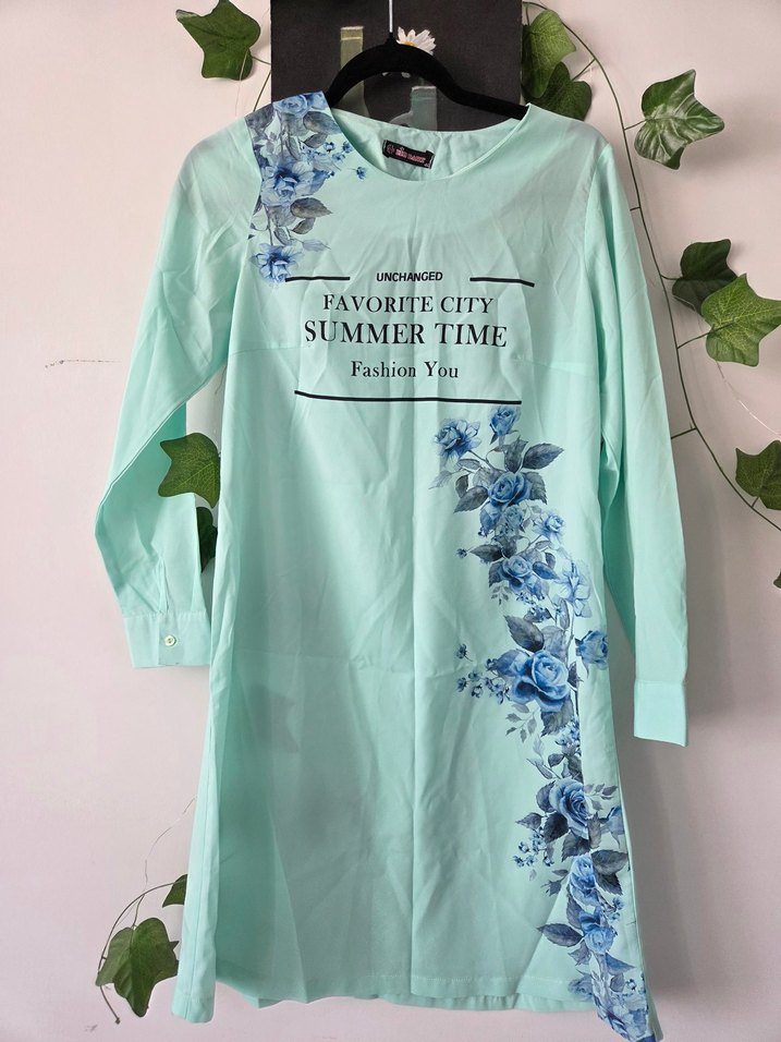 Pamuklu, uzun kollu, bol kesim. Turkuaz ve çiçek baskılı, drapeli, yuvarlak yakalı, rahat bir model. Yazı detayları içerir.