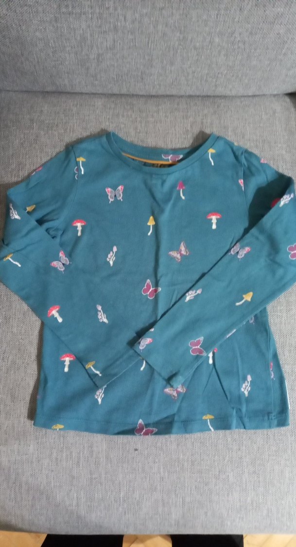 Turkuaz renkli, uzun kollu kız tişörtü, bol kesim ve bisiklet yaka tasarıma sahiptir. Baskılı kelebek ve mantar desenleriyle, yumuşak örme sentetik kumaştan yapılmıştır.