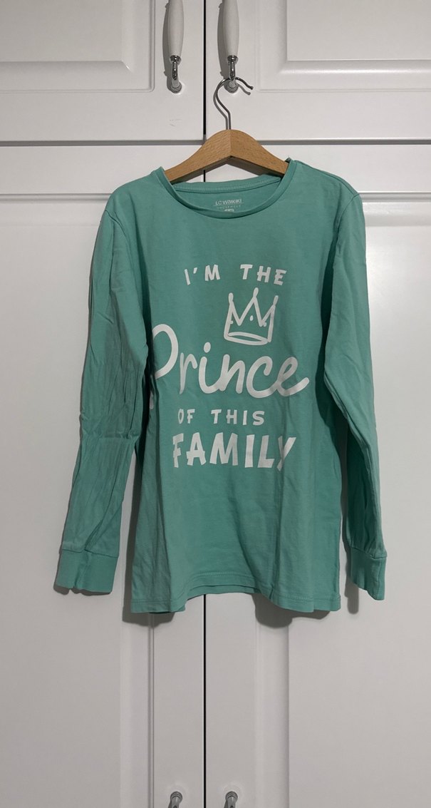 Turkuaz renkli, uzun kollu tişörtü, bol kesim ve "I'm the Prince of this Family" baskısına sahip, pamuklu, 9-10 yaş ancak kalıba göre değişir maksimum 140 cm fotoğraflarda mevcut sırtında bir leke var.