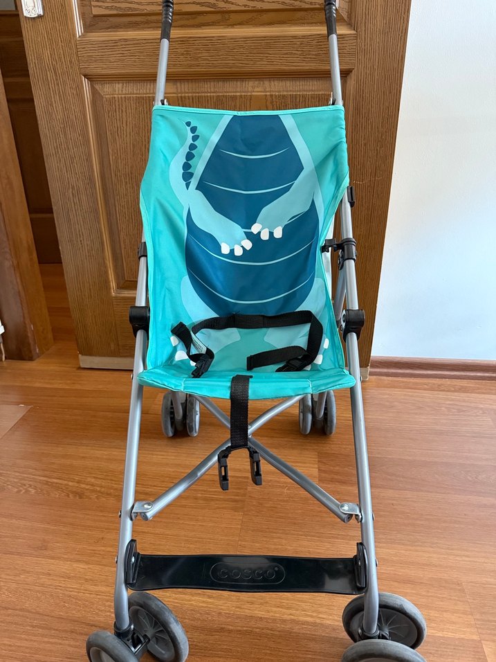 Turkuaz renkli bebek arabası, hafif iskelet ve güvenli oturma için emniyet kemeri ile donatılmıştır. Oturma kısmında eğlenceli dinozor deseni bulunur ve tekerlekleri kolay hareket sağlar.