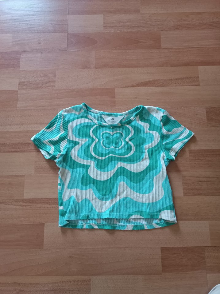 Turkuaz pastel batik desenli, kısa kollu, bisiklet yaka ve fırfırlı, vücuda oturan kız tişörtü. Bohem ve retro tarzda. xs beden için uygundur