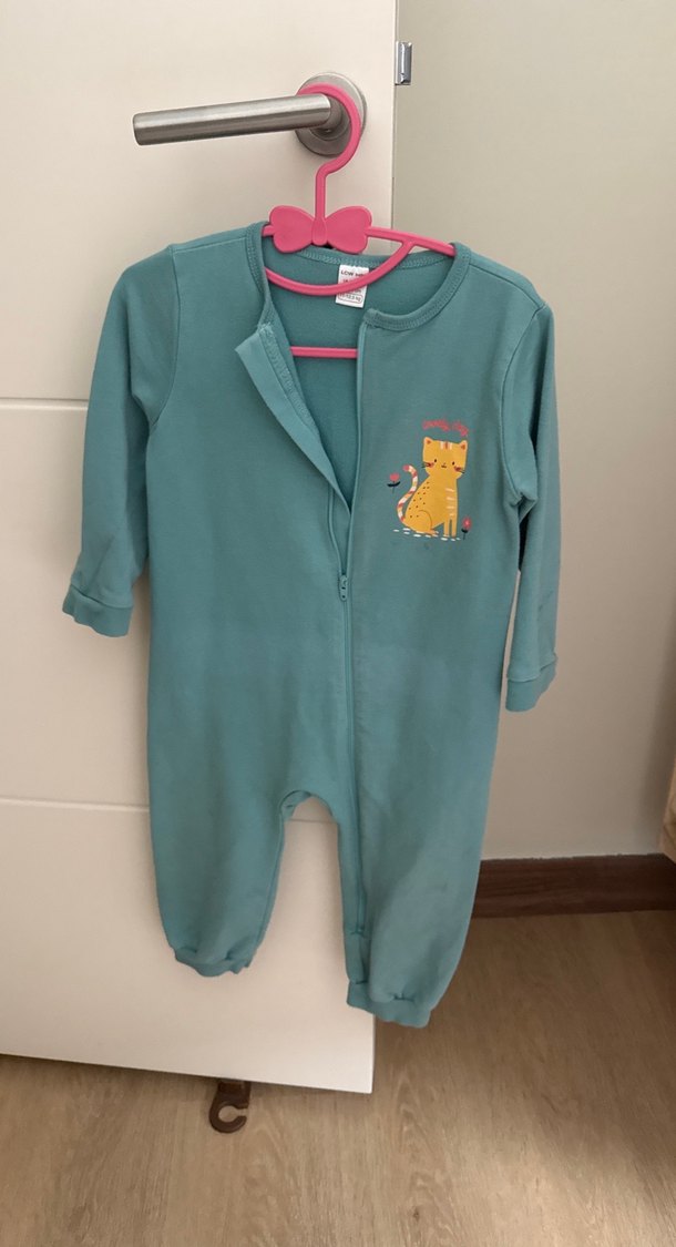 Uzun kollu, yuvarlak yakalı bebek tulumu, ön fermuarlıdır. Yumuşak ve sıcak kumaştan, pastel turkuaz renkte ve küçük kedi baskılıdır. 18-24 aylık hiç kullanılmadı