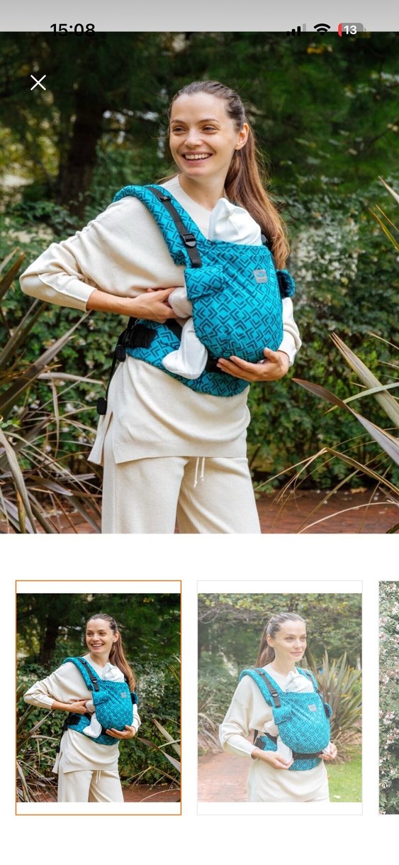 Ayarlanabilir askıları ve ergonomik desteği olan turkuaz renkli bebek taşıyıcı, hafif ve desenli kumaştan üretilmiştir. Yeni gibidir çok az kullanıldı.