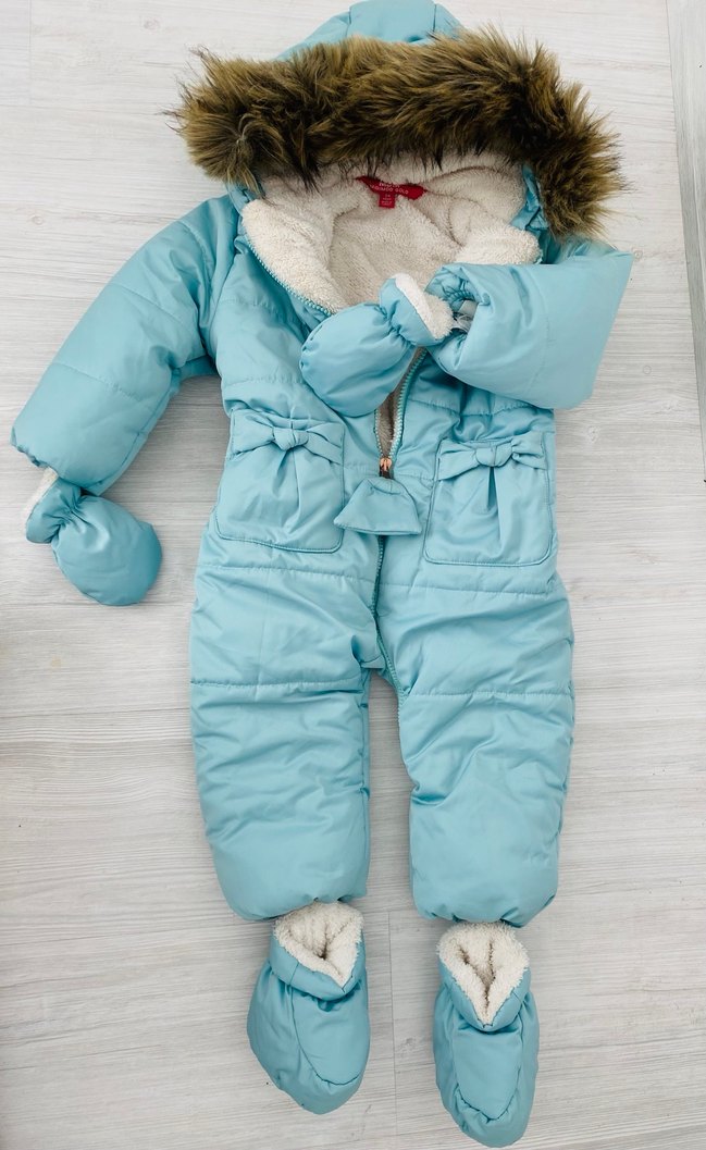 Pastel Turkuaz renkte, kapüşonunda kürk detaylı, yumuşak ve sıcak kumaş astarlı bebek kız tulumu. Eldiven ve patiklerle tam koruma sağlar. ❄️ çıtçıtlı eldiven ve patik tercihe bağlı çıkarabilirsiniz