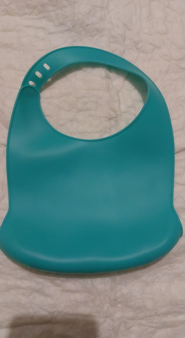 Turkuaz renkli, ayarlanabilir boyun kısmına sahip, döküntüleri yakalamak için tasarlanmış bebek mama önlüğü. babyco markası hiç kullanılmadı tertemiz