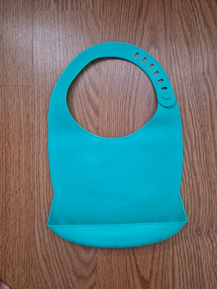 Ayarlanabilir boyun kapamalı, kolay temizlenen yumuşak malzemeden yapılmış turkuaz bebek mama önlüğü. Dökmeleri etkili şekilde yakalar.