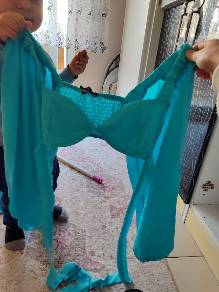 askılı, yumuşak kumaştan yapılmış açık turkuaz renkli ş ve M beden mevsuttur sıfır etiketli ürün