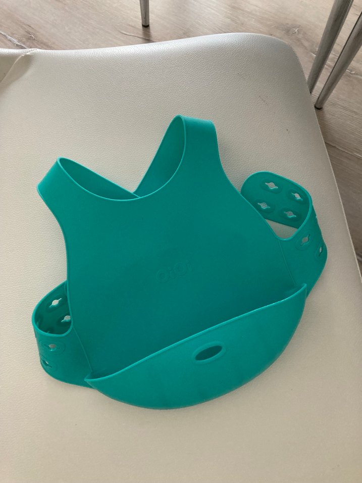 Turkuaz renkli, ayarlanabilir kayışlı bebek önlüğü. Kolay temizlenir ve kıyafetleri korur.