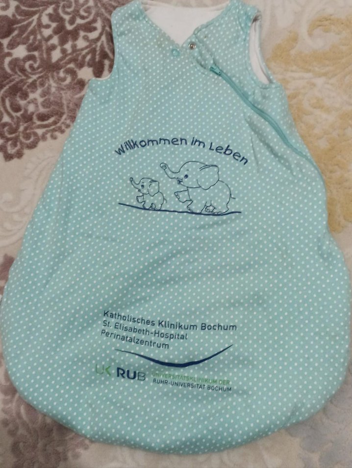 Turkuaz renkli, baskılı fil figürlü ve hoş geldin yazılı bebek uyku tulumu. Yumuşak kumaştan, pastel puantiyeli desenli.