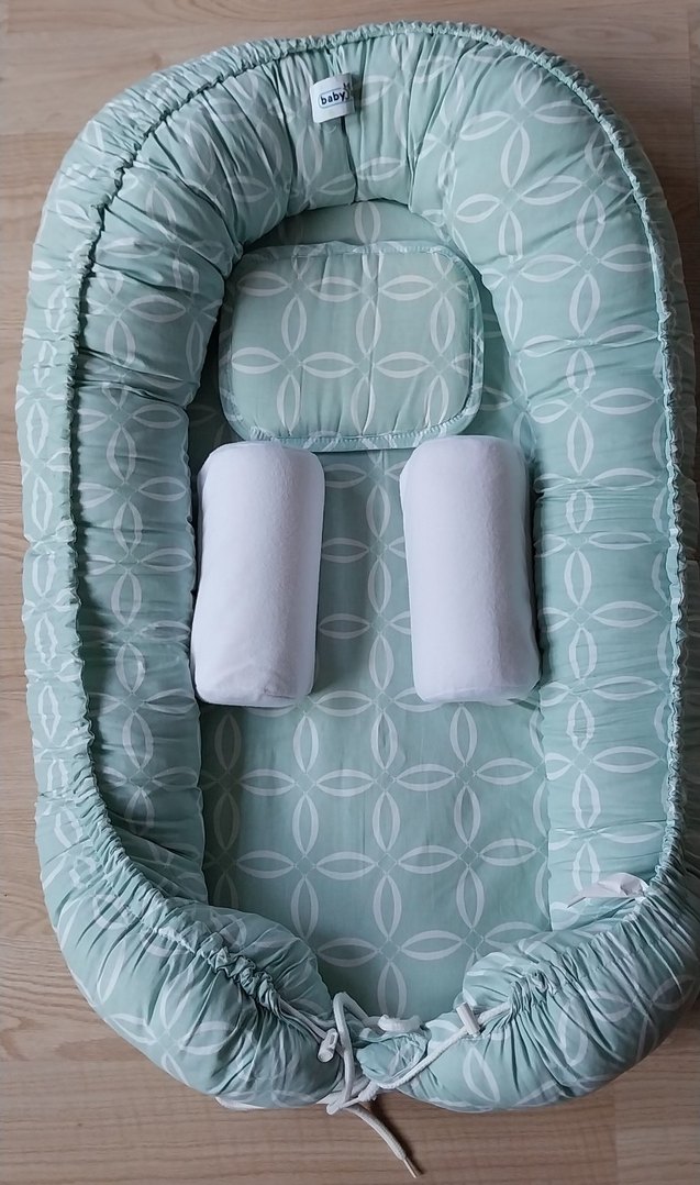 Pastel turkuaz renkte, yumuşak sentetik kumaştan yapılmış bebek uyku yatağı. İki beyaz destek yastığı ve küçük bir yastık içerir. ️Çok iyi durumda az kullanılmıştır.