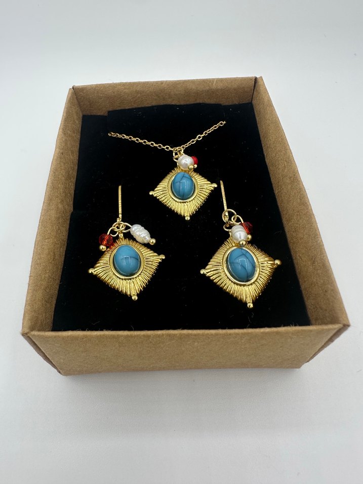 Hafif batik desenli turkuaz taşlı, ince zincirli kısa bohem kolye, ve küpe günlük kullanıma uygun. Adet fiyatı: 200 TL Takım: 400 TL #bohemtakı #vintage #takı #goldtakı #çeliktakılar #yazlıktakı #trend #kolye #küpe