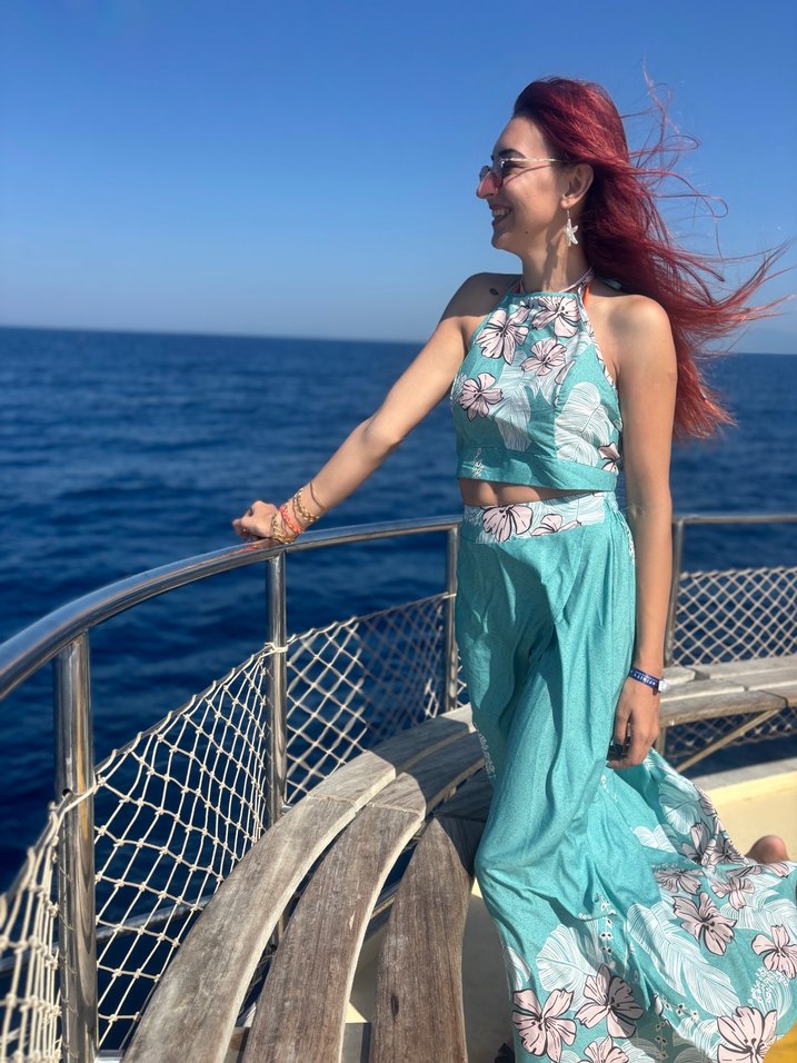 Açık renk turkuaz uzun etekli ikili takım , salaş kesim ve askısız yakaya sahip. Batik desenli ve drapeli tasarım, yumuşak sentetik kumaştan, açık hava için uygun. 1 kez giyildi