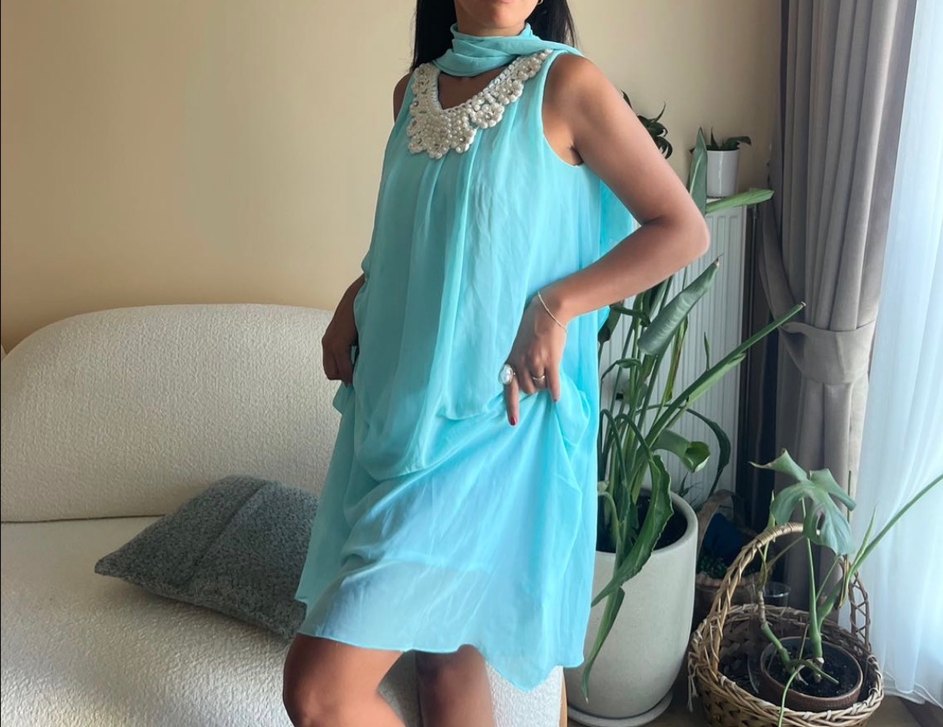 Turkuaz renkte, yüksek yakalı ve kolsuz, bol kesim uzun elbise. Drapeli kumaşı ve nakış detaylarıyla bohem tarzda, düğünler için uygun.
