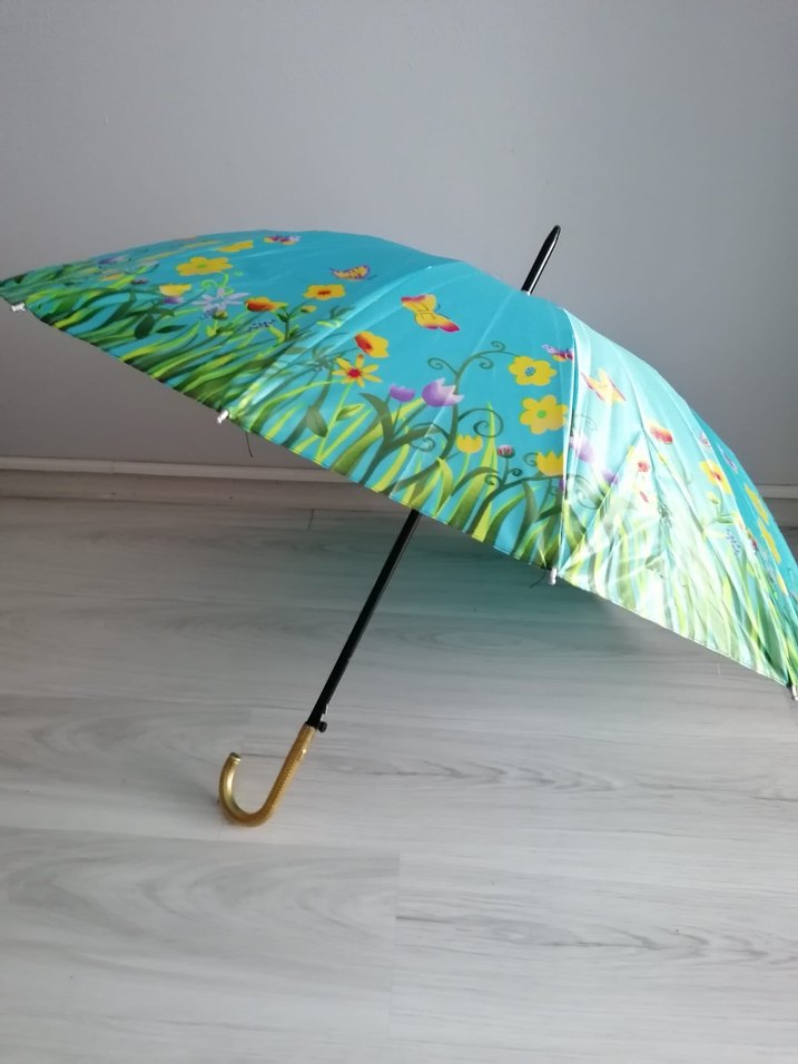 Turkuaz şemsiye, renkli çiçek ve kelebek desenleriyle yumuşak kumaş kaplamaya ve klasik kıvrımlı saplıdır. 14 telli