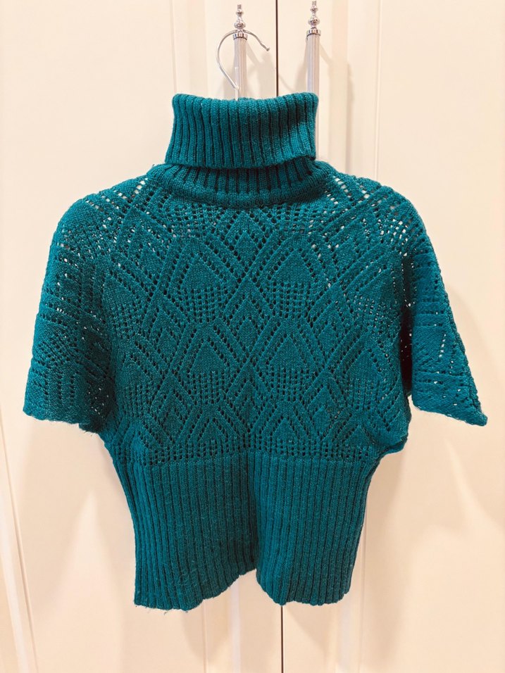 Turkuaz renkli, kısa kollu, balıkçı yakalı örme kazak. Bohem tarzı, rahat ve renkli görünüm sağlar. Günlük kullanım için uygundur. Vintage xs s gibi