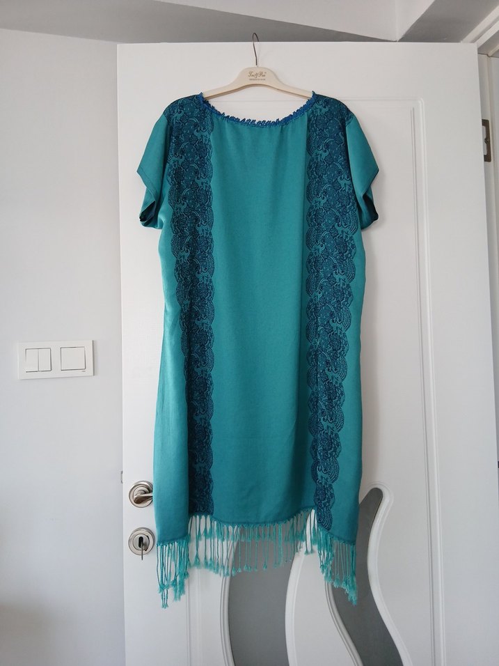 Turkuaz renkli, gevşek kesim ve kısa kollu tunik. İpek gibi kumaştan, drapeli ve baskılı detaylı, yuvarlak yakalı ve püsküllü etek uçlu. Günlük kullanıma uygun parlak ve canlı görünüşte. kol altı 61 boy 90 cm.serin tutuyor çok rahat