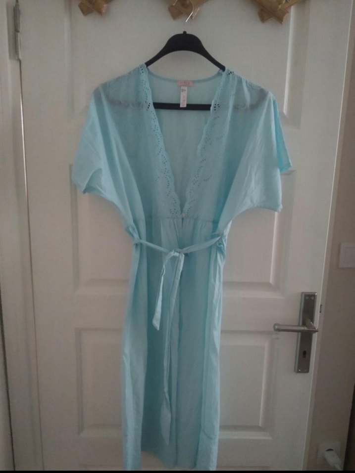 Turkuaz renkte, kısa kollu, midi boyda, bol kesim bohem tarzı kadın elbisesi. Dantel detaylı ve bağlamalı bel tasarımı ile rahat kullanım sağlar.