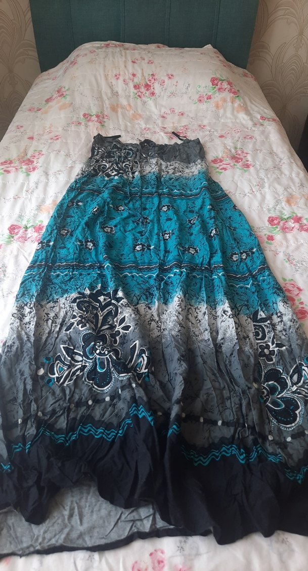 Turkuaz renkli, bol kesim ve drapeli uzun etek. Tie-dye desenleriyle bohem tarzını yansıtır. Düğün ve gündelik kullanım için uygundur.