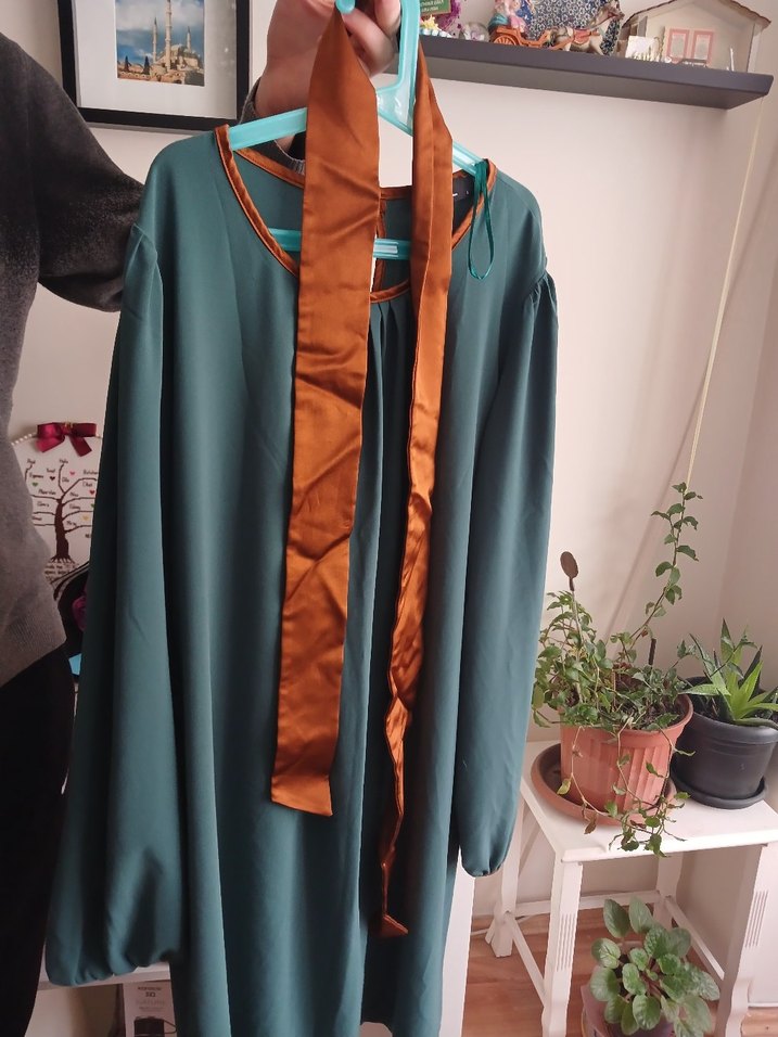 Turkuaz renkte, uzun kollu, yuvarlak yakalı, bol ve dökümlü kesime sahip midi boy bohem tunik. uzunluk 90 cm gogus 54 cm Tam turkuaz degil koyu bir rengi var