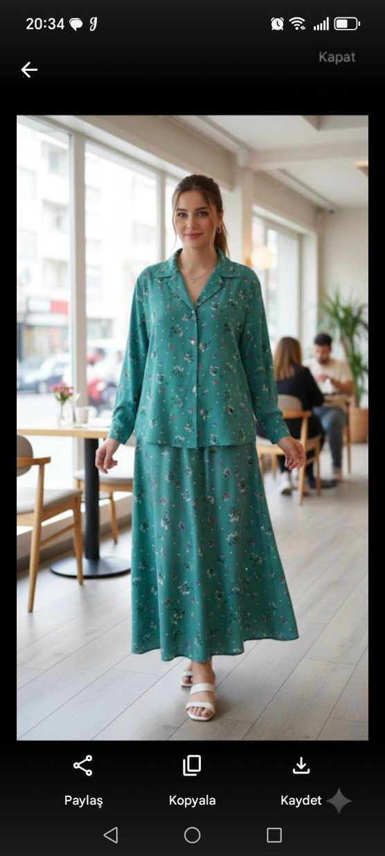 Turkuaz renkte, uzun kollu ve uzun boylu, bol kesim bohem, hafif batik desenlidir. Sandıktan çıktı büyük beden