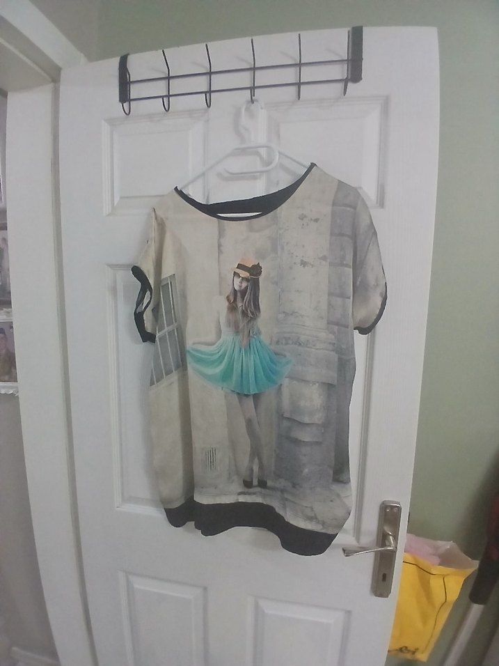 Turkuaz renkte, transparan sentetik kumaştan üretilmiş, kısa kollu ve bol kesim mini hamile tişörtü. Baskılı ve yuvarlak yaka detayına sahip. 60 cm genıslık 75 cm uzunluk