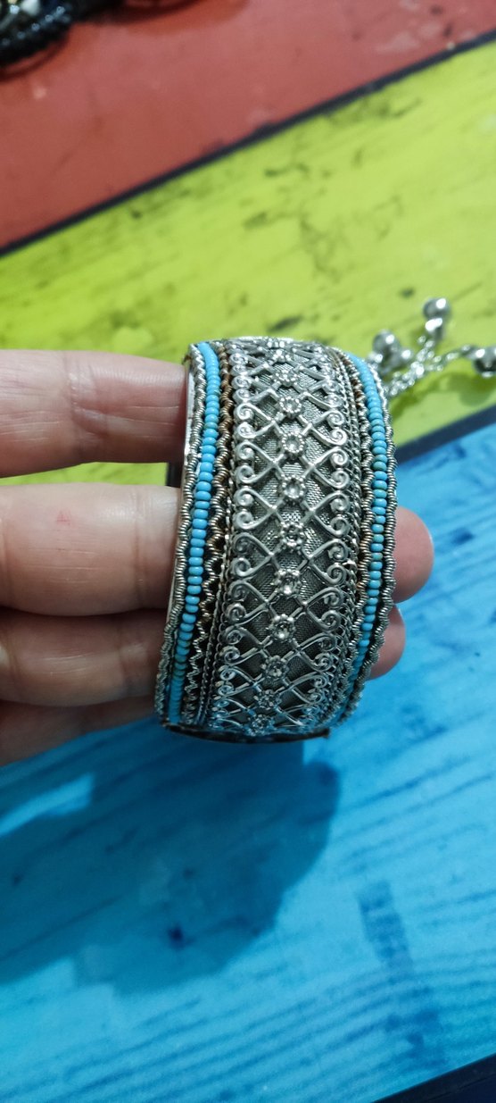 Turkuaz boncuklar ve işlemeli desenlerle süslenmiş bohem tarzda kadın bilekliği, düğünler için uygun.
