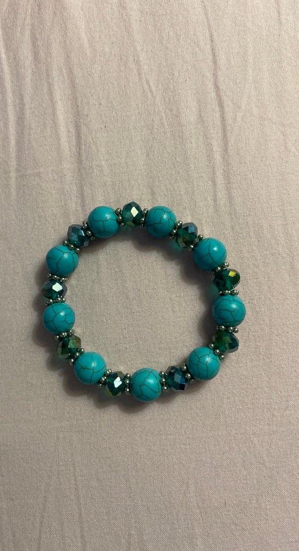 Turkuaz ve parlak boncuklardan oluşan bohem tarzda, günlük kullanıma uygun renkli ve desensiz bileklik. Gerçek taş