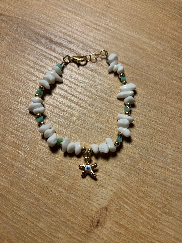 Bu bohem tarz bileklik, beyaz ve turkuaz boncuklar ile küçük bir denizyıldızı figürü içerir, günlük kullanım için uygundur.
